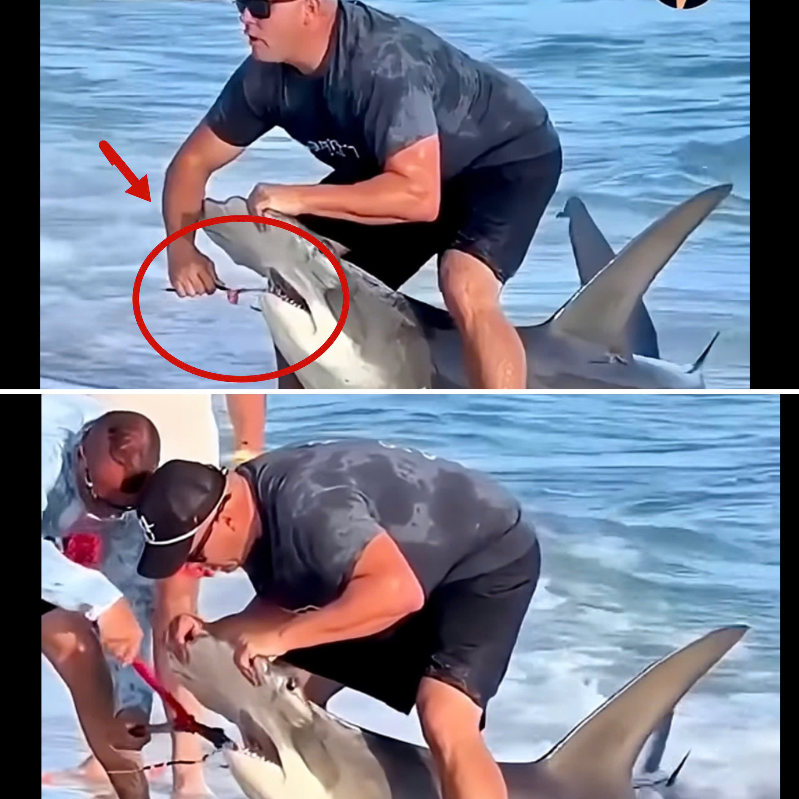 Instead of walking away or ignoring the creature’s distress, they waded into the water and carefully approached the shark. Holding it down with steady hands, they worked as quickly and gently as possible, using their knowledge and skill to remove the hook from its mouth. The shark, exhausted and hurt, resisted at first, but the men remained calm, focused, and determined to give this magnificent creature a second chance at freedom.